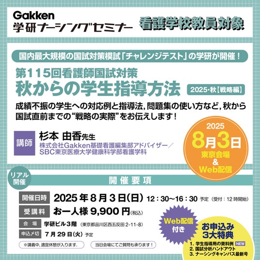 株式会社 学研ホールディングス(東京・品川/代表取締役社長:宮原博昭)のグループ会社、株式会社 Gakken(東京・品川/代表取締役社長:南條達也)は、2025年8月3日(日)に、看護教員を対象に夏休み明けからの学生指導法が満載の「第115回 看護師国試対策 2025・秋【戦略編】」セミナーを学研ビル(東京・五反田)にて開催いたします。