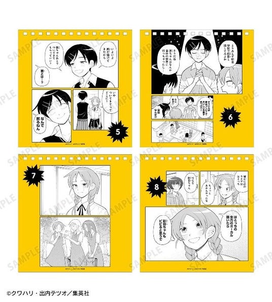 出内テツオ先生が作画したちびキャライラストの鳩野ちひろ、幸山厘、内田桃、藤井彩目、鷹見項希、水尾春一、田口流哉、遠野元を缶バッジ4個セットに仕上げました。