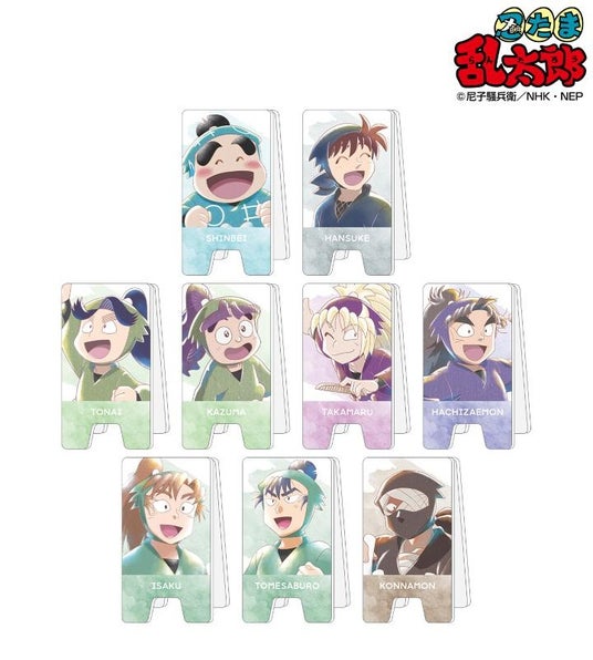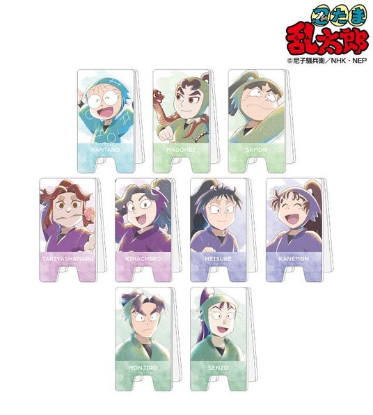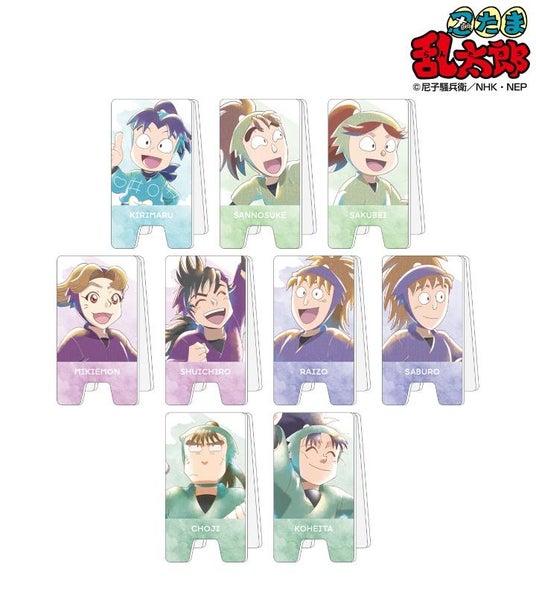 猪名寺乱太郎、伊賀崎孫兵、神崎左門、平滝夜叉丸、綾部喜八郎、久々知兵助、尾浜勘右衛門、潮江文次郎、立花仙蔵のイラストを新たなタッチで魅力的に表現し、立て看板風のアクリルメモスタンドに仕上げました。