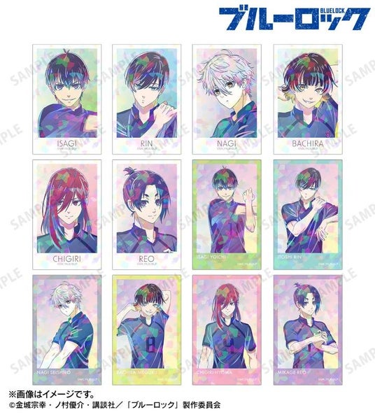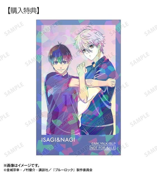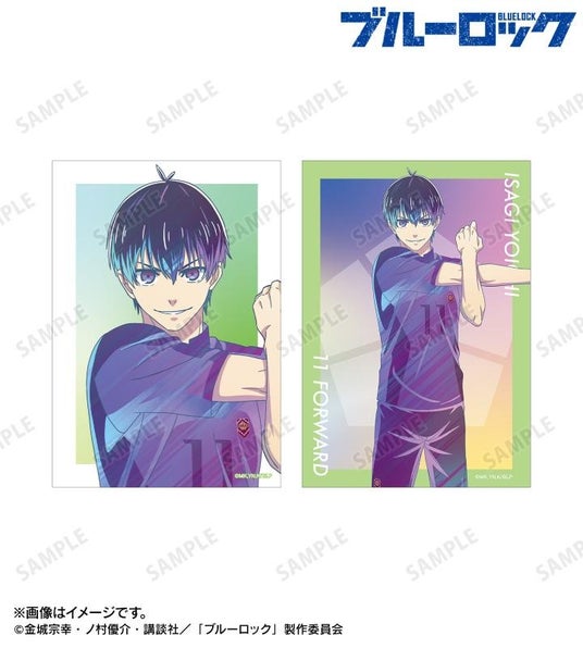 潔 世一、糸師 凛、凪 誠士郎、蜂楽 廻、千切 豹馬、御影 玲王の描き下ろしイラストを新たなタッチで魅力的に表現し、ブルーロックマーク、ユニフォーム番号を組み合わせてデザインしたブロマイド2枚セットに仕上げました。