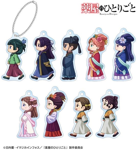猫猫、壬氏、高順、玉葉妃、梨花妃、里樹妃、楼蘭妃、小蘭、子翠が歩いているちびキャラを新たに描き起こし、アクリルキーホルダーに仕上げました。