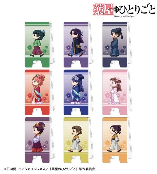 猫猫、壬氏、高順、玉葉妃、梨花妃、里樹妃、楼蘭妃、小蘭、子翠が歩いているちびキャラを新たに描き起こし、立て看板風のアクリルメモスタンドに仕上げました。