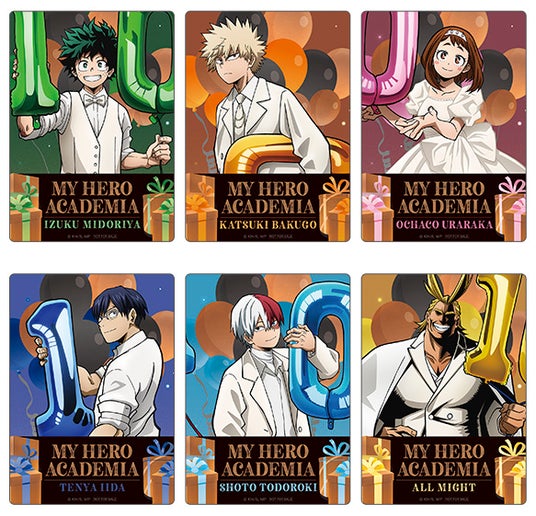 開催内容:期間中、アニメ『僕のヒーローアカデミア』関連(アニメ『ヴィジランテ -僕のヒーローアカデミア ILLEGALS-』を含む)のキャラクターグッズをご購入・ご予約内金1,100円(税込)毎、書籍・オーディオ・ビジュアル商品をご購入・ご予約(内金1,100円(税込)以上必須)1点毎、グラッテ飲食・有償特典をご購入・ご予約(内金全額必須)1点毎に【アニバーサリーカード(全6種)】を1枚プレゼントいたします。