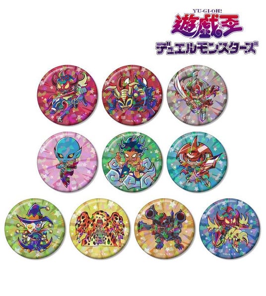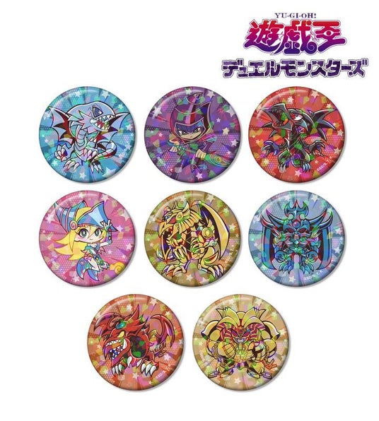 青眼の白龍、ブラック・マジシャン、真紅眼の黒竜、ブラック・マジシャン・ガール、ラーの翼神竜、オベリスクの巨神兵、オシリスの天空竜、召喚神エクゾディアのイラストをトゥーンモンスターになったイメージで描き起こし、ホログラム加工を施した缶バッジに仕上げました。