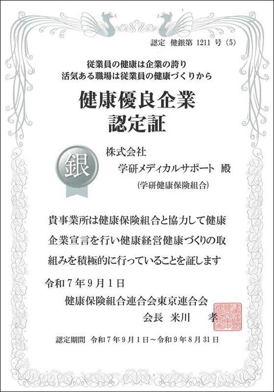 株式会社 学研ホールディングス(東京・品川/代表取締役社長:宮原博昭)のグループ会社、株式会社 学研メディカルサポート(東京・品川/代表取締役社長:清水修)は、健康保険組合連合会東京連合会に「健康企業宣言※」を行い、健康経営に向けた職場の健康づくりや、環境整備などの積極的な取り組みが評価され、2025年9月1日(月)付で健康優良企業「銀の認定」(健銀第1211号(5))を取得いたしました。2020年に初めて取得してから、今年で6年連続の認定となります。