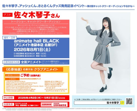 全国アニメイト・アニメイト通販にて2026年6月20日(土)発売の「佐々木琴子さん」グッズをご予約内金(通販は注文時の決済)3,000円(税込)毎にイベント応募シリアルを1つプレゼントいたします。