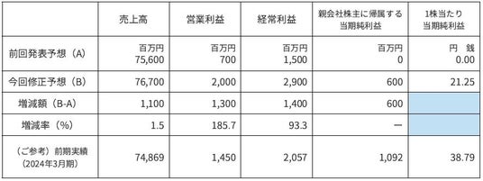 当社は、2025年3月期において営業外収益(持分法による投資利益)および特別損失(減損損失)を計上する見通しとなりました。併せて、最近の業績動向等を踏まえ、2024年10月31日に公表しました通期業績予想(連結・個別)を下記のとおり修正いたします。