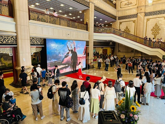 台北会場となった国家音楽庁は、38年にわたる戒厳令が解除された1987年にオープンした場所で、たとえるなら国立劇場にあたる。館内の吹き抜けには大きなスクリーンが設置された(写真参照)。映画のポスターにもなったF14戦闘機を背にするトム・クルーズが大きく映し出され、前にはレッドカーペットが敷かれている。来場者はその前で記念撮影をしていた。撮影を待ちわびる列は、開演直前、そして公演の途中で挟まれた休憩時間、終了後まで続いた。