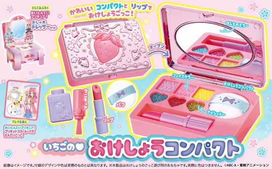 「おけしょうコンパクト」は、大きないちごが印象的なかわいらしいデザイン。中を開くと、ミラー、フェイスカラー、アイシャドーとパフやリップがセットされています。ミラーは本物で、本格的なごっこ遊びができるのが魅力的です。ほかに、リップのカラーとおそろいの、かわいいマニキュアも付いてきます。