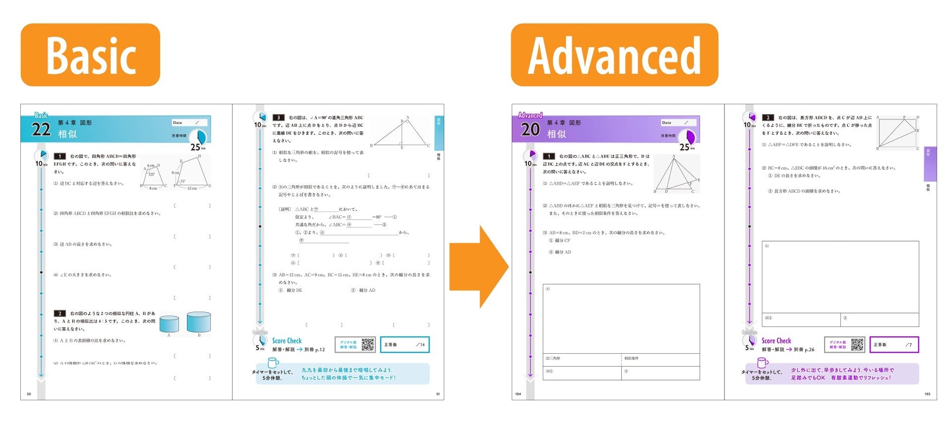 前半の基礎的な問題(Basic)では、入試に向けて確実に押さえるべきポイントを確認し、着実に定着させることができます。後半の発展的な問題(Advanced)では、さらに得点を伸ばしてライバルに差をつけるために必要な応用力を養うことができます。