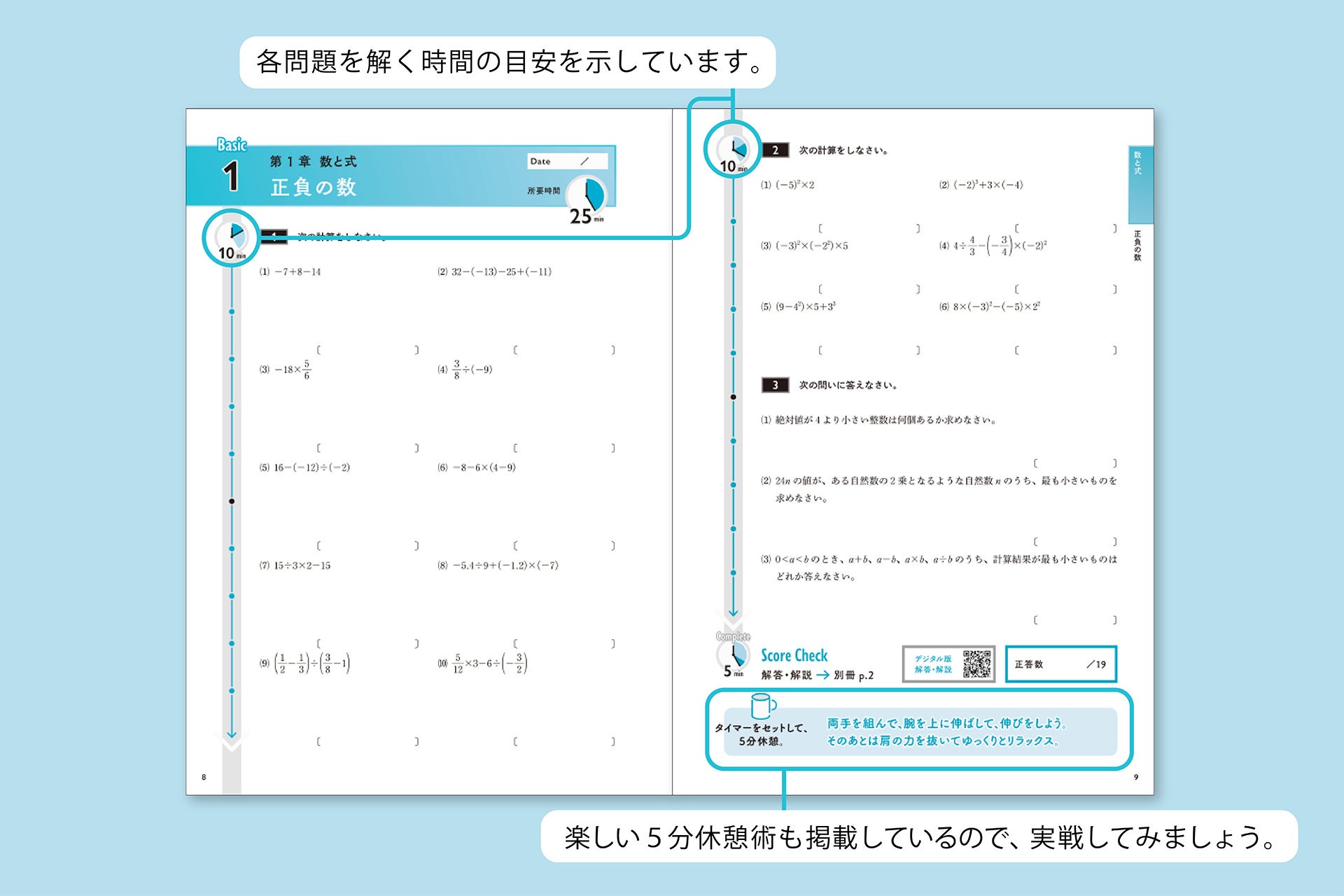 ▲各問題を解く時間の目安や楽しい5分休憩術も掲載しており、自然と効率的な学習サイクルが実現できます。