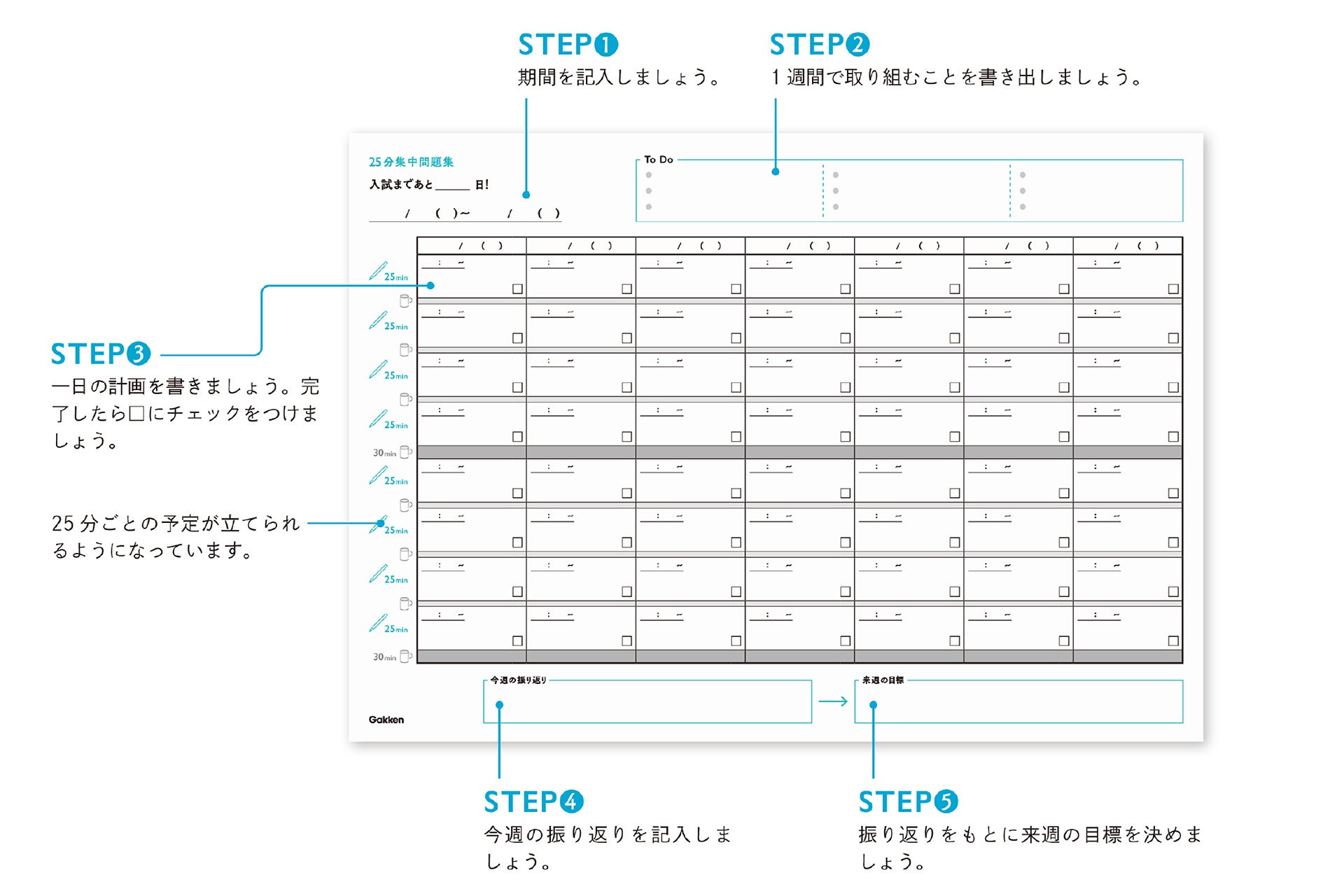 このシートでは、1週間分のやるべき勉強を書き出して、それらを25分ごとの予定として書き込めるようになっているので、「25分集中+5分休憩」の学習サイクルを自然と実現できます。
