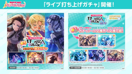 本ライブ開催を記念して、「ライブ打ち上げガチャ」が開催中です。RAISE A SUILENメンバーの出現率がアップするほか、様々なアイテムと交換できるピース付きとなります。