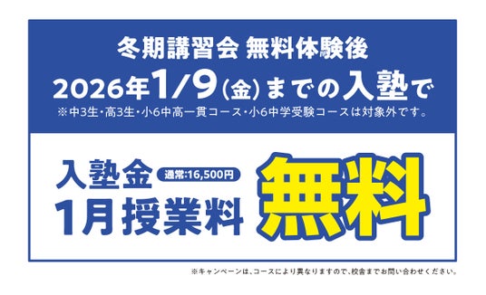 また、進学塾サインワンの冬期講習会をご体験いただき、2025年1月9日までにご入塾のお手続きをいただきますと、入塾金16,500円が無料、さらに1月分の授業料も無料になるキャンペーンを行っております(学年・コースによって異なる場合があります。詳細はお問い合わせください。)。