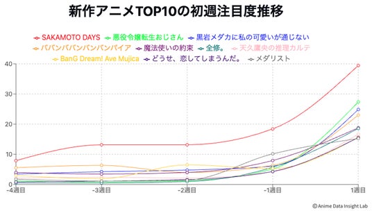 新作アニメにおいて、注目すべき要素としてどのように伸びていったかという点が挙げられます。全体でも3位に入った『SAKAMOTO DAYS』は、週刊少年ジャンプ連載という強みもあり、4週前の時点で7.9と比較的高めのベースラインを確保していました。そこから13.2、18.4と着実に注目度を伸ばし、初週には39.5まで一気に跳ね上がっています。
