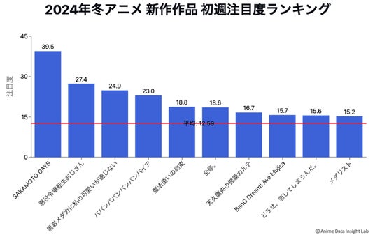 株式会社ブシロード (本社:東京都中野区、代表取締役社長:木谷高明)のグループ分析組織にあたるアニメデータインサイトラボ(代表:大貫佑介)は、アニメビジネスにおける調査を実施しました。今回は2025年冬アニメ作品を対象に、放送開始の前から放送1週目までの検索量データを用い、2025年冬アニメ全57作品(新作40作品、続編17作品)を対象に分析を行い、その結果を公表いたします。報道関係の皆様におかれましては、ぜひ本情報をお取り扱いいただきますよう、お願い申し上げます。