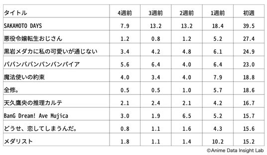 一方で、『悪役令嬢転生おじさん』は4週前が1.2と低かったものの、放送1週前に5.2から初週の27.4へと約5倍に急伸しました。『メダリスト』も4週前の1.8から放送1週前に10.2まで上昇し、初週には15.2を記録。これらの作品は放送直前のSNSやメディアでの露出施策が奏功し、大幅な伸びにつながったと考えられます。