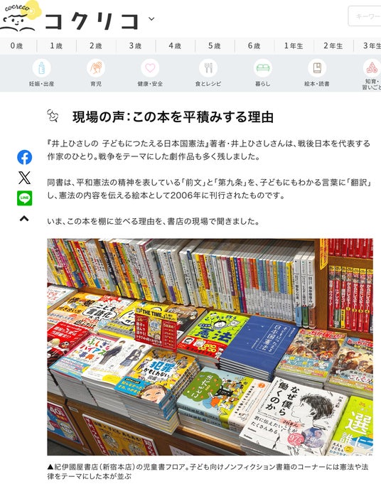 株式会社 講談社 児童図書出版部が運営する、子育てと読書のWebメディア コクリコ[cocreco]は、5月3日の憲法記念日を目前にしたいま、20年の時を経て注目される『井上ひさしの 子どもにつたえる日本国憲法』について、書店や関係者に取材した記事を、2026年4月23日(木)12:00より公開配信したことをお知らせいたします。