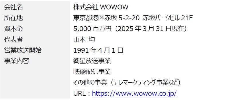 WOWOW は日本初の民間衛星放送局として、1991 年4 月1 日有料放送事業を開始。現在 「WOWOW プライム」 「WOWOW ライブ」 「WOWOW シネマ」の3 チャンネルと動画配信サービス「WOWOW オンデマンド」を通じて、国内外の映画や音楽ライブ、海外ドラマ、世界のトップスポーツ、ステージ、アニメ、そしてオリジナルドラマなどのエンターテインメントを月額税込 2,530 円で提供しています。