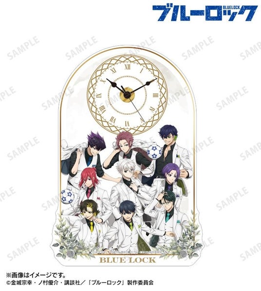 潔 世一、糸師 凛、凪 誠士郎、烏 旅人、蜂楽 廻、千切 豹馬、御影 玲王、糸師 冴、オリヴァ・愛空の描き下ろしイラストをデザインしたアクリルスタンド時計です。