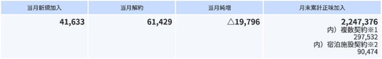 ※2:宿泊施設の客室で視聴するための宿泊施設事業者との契約については、視聴料金を個別に定めており、当該宿泊施設における契約客室の累計正味加入件(室)数は、月未累計正味加入件数に含めております。