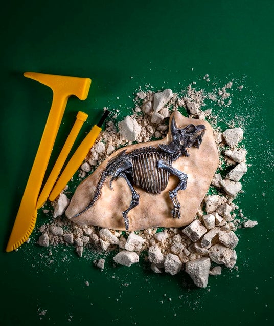▲恐竜学者になりきれる、本格的な発掘セット。ハンマーと、たがねで石こうを掘ってブラシでクリーニングしよう。