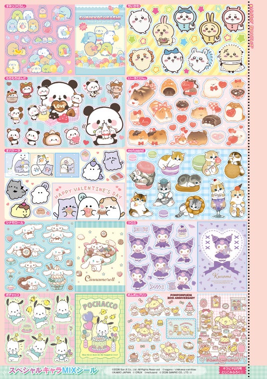 今号のスペシャルキャラMIXシールは、「ちいかわ」「すみっコぐらし」「もちもちぱんだ」「いーすとけん。」「オバケーヌ」「mofusand」「シナモロール」「クロミ」「ポチャッコ」「ポムポムプリン」の全10キャラクターです。自分のお気に入りのものに貼って、楽しんでください。