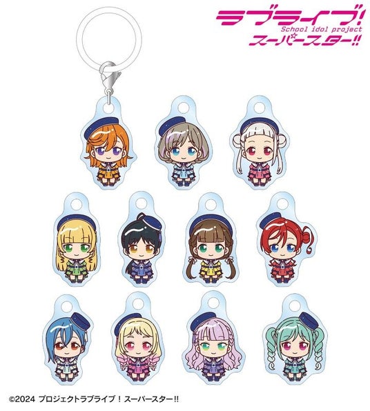 澁谷かのん、唐 可可、嵐 千砂都、平安名すみれ、葉月 恋、桜小路きな子、米女メイ、若菜四季、鬼塚夏美、ウィーン・マルガレーテ、鬼塚冬毬がちょこんと立っているちびキャラを新たに描き起こし、ダイカットのアクリルチャームに仕上げました。