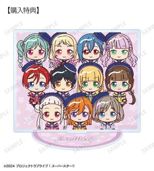 澁谷かのん、唐 可可、嵐 千砂都、平安名すみれ、葉月 恋、桜小路きな子、米女メイ、若菜四季、鬼塚夏美、ウィーン・マルガレーテ、鬼塚冬毬がちょこんと立っているちびキャラを新たに描き起こし、アクリルスタンドに仕上げました。