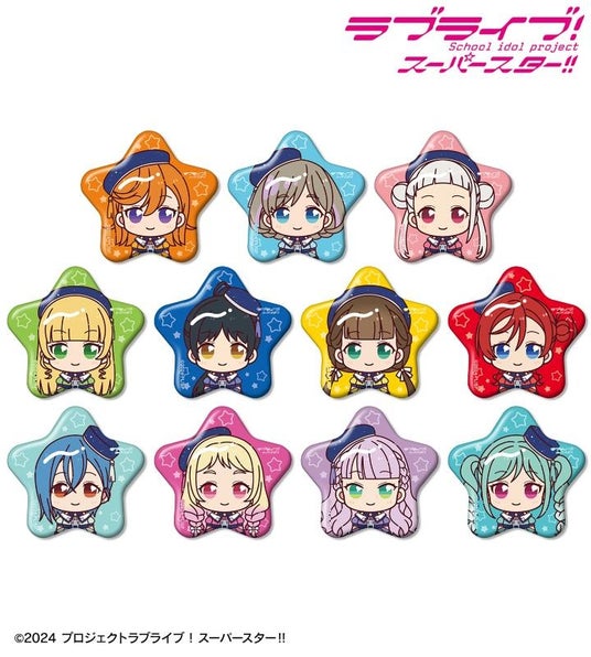 澁谷かのん、唐 可可、嵐 千砂都、平安名すみれ、葉月 恋、桜小路きな子、米女メイ、若菜四季、鬼塚夏美、ウィーン・マルガレーテ、鬼塚冬毬がちょこんと立っているちびキャラを新たに描き起こし、星型の缶バッジに仕上げました。