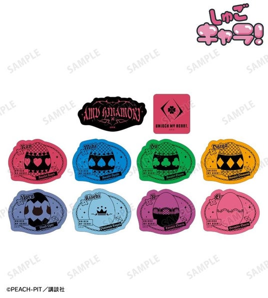 日奈森 あむの名前、「UNLOCK MY HEART.」のイメージマーク、ラン、ミキ、スゥ、ダイヤ、ヨル、キセキ、イル、エルのしゅごたまのモチーフをフレークシールに仕上げました。