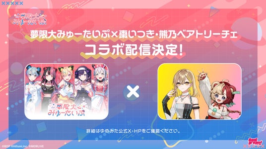 株式会社ブシロードミュージックは、バンドリ!プロジェクトバンド「夢限大みゅーたいぷ」(通称:ゆめみた)が、4月11日(金)にYouTubeの公式生配信にて公開した、コラボ配信や対バンライブなどに関する新情報についてお知らせいたします。