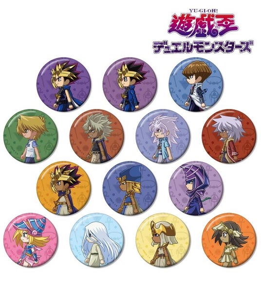 闇遊戯、武藤遊戯、海馬瀬人、城之内克也、闇マリク、闇バクラ、盗賊王バクラ、アテム、セト、ブラック・マジシャン、ブラック・マジシャン・ガール、キサラ、マハード、マナが歩いているちびキャラを新たに描き起こし、缶バッジに仕上げました。