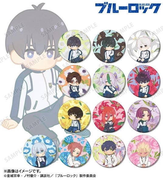 潔 世一、糸師 凛、凪 誠士郎、雪宮 剣優、乙夜 影汰、烏 旅人、蜂楽 廻、千切 豹馬、御影 玲王、氷織 羊、糸師 冴、オリヴァ・愛空、士道 龍聖のイラスト、各キャラクターをイメージした花をボタニカルデザインに落とし込んで繊細なタッチで新たに描き起こし、マットな手触りの缶バッジに仕上げました。