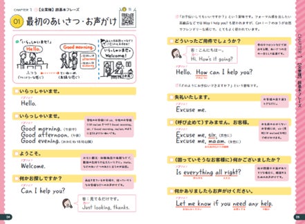 冒頭の章では、全業種共通で活用することができる便利なフレーズを厳選!「最初の挨拶」、「ご案内」、「お見送り」など、どの業種でも使用する汎用性の高いフレーズばかりなので、ここを押さえるだけでも安心です。さらに、続く各章では【飲食業、販売業、宿泊・レジャー、交通】など、業種別に必要なフレーズを掲載しています。それぞれの業種でしか使わない独特な表現まで網羅しているので、探し求めていた“本当に使える英語表現”を見つけることができます。