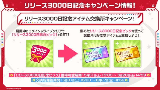 ログインやライブプレイを通じて「リリース3000日記念ピック」を獲得し、交換所にて★4以上確定ガチャチケットなどの豪華アイテムと交換することが可能です。