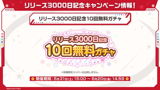 5月31日(土)15時~6月20日(金)14時59分までの期間中、1回のみ10回無料ガチャが引けるキャンペーンを開催いたします。