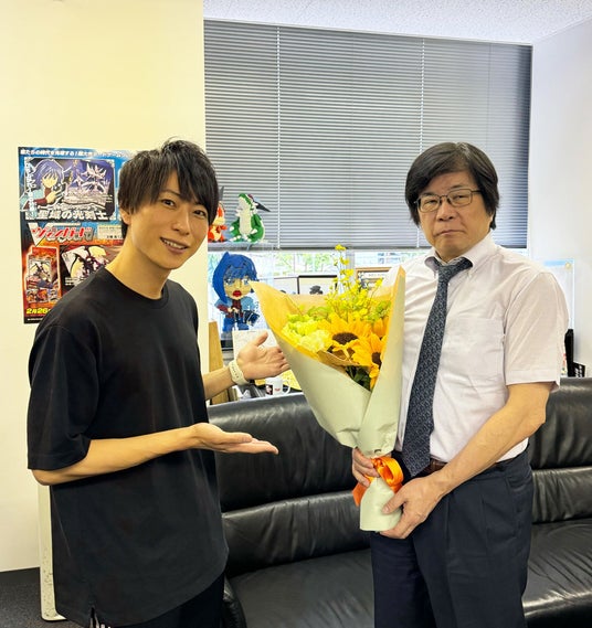 お花を受け取った木谷社長からは、ゲーム発売へのお祝いとともに「もう15年!早いですね」と森嶋さんが声優としてブシロード作品に携わってきた年月への労いの言葉をいただきました。