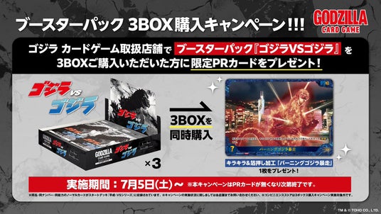- その他の取扱店舗と同様に、ブースターパック『ゴジラVSゴジラ』を3ボックス購入で、キラキラ&箔押し加工の限定PRカード「バーニングゴジラ暴走」を1枚プレゼント!