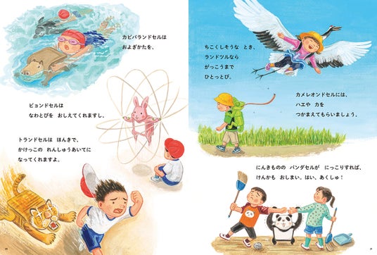 ▲カピバランドセル、ピョンドセル、トランドセル、ランドツル……。作者のダジャレが光りまくっている上に、それぞれとても面白い機能が。親子でたくさん笑えます。