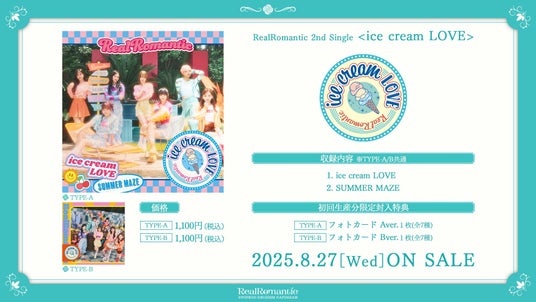 少女時代「Gee(Japanese Ver.) 」やPRODUCE 101 JAPAN THE GIRLS「LEAP HIGH! ~明日へ、めいっぱい~」、TVアニメ「少女☆歌劇 レヴュースタァライト」全楽曲作詞など数多くのアイドルや作品の作詞を手掛け、ヒット曲を世に送り出してきた作詞家・中村彼方をプロデューサーに迎えた7人組アイドルグループ「RealRomantic(リアルロマンティック)」は、8月27日(水)リリース予定のRealRomantic 2nd Single「ice cream LOVE (アイスクリームラブ)」より、リード曲「ice cream LOVE」のミュージックビデオを公開する。