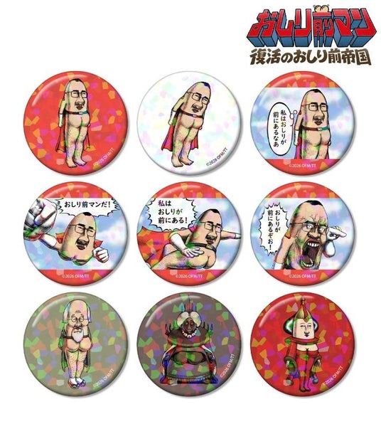 おしり前マン、おしり前レジェンド、黒幕製薬の社長、おしり前姫のカラーイラストをホログラム加工を施した缶バッジに仕上げました。