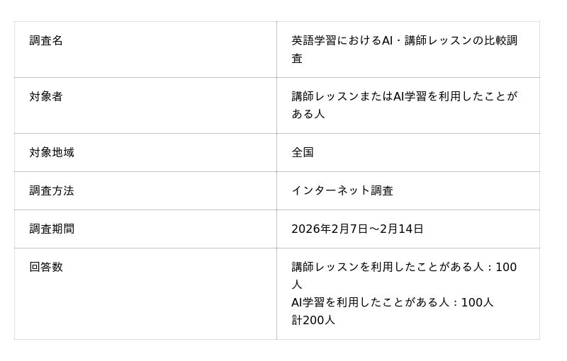 この結果から、英語学習の目的は日常的な英会話が中心である一方で、AI学習は日常・旅行向け、講師レッスンはビジネス向けに使い分けられている傾向がうかがえる。