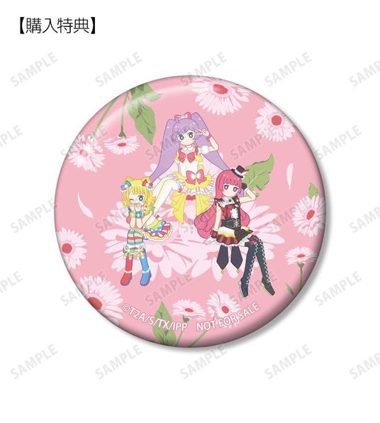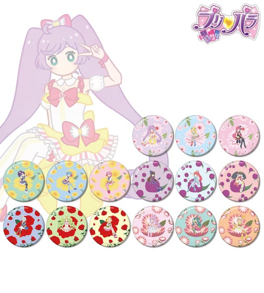 真中らぁら、南みれぃ、北条そふぃ、東堂シオン、ドロシー・ウェスト、レオナ・ウェスト、黒須あろま、白玉みかん、ガァルル、紫京院ひびき、ファルル、緑風ふわり、真中のん、月川ちり、太陽ペッパーのイラストをボタニカルデザインに落とし込んで繊細なタッチで新たに描き起こし、缶バッジに仕上げました。