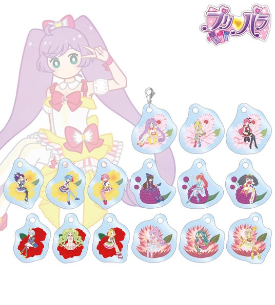 真中らぁら、南みれぃ、北条そふぃ、東堂シオン、ドロシー・ウェスト、レオナ・ウェスト、黒須あろま、白玉みかん、ガァルル、紫京院ひびき、ファルル、緑風ふわり、真中のん、月川ちり、太陽ペッパーのイラストをボタニカルデザインに落とし込んで繊細なタッチで新たに描き起こし、ダイカットのアクリルチャームに仕上げました。