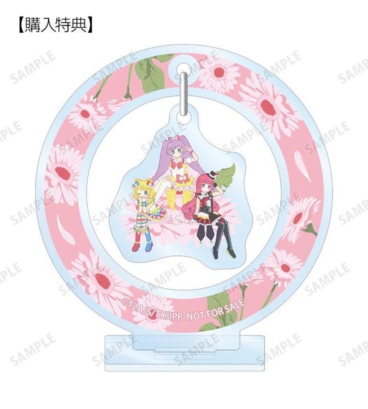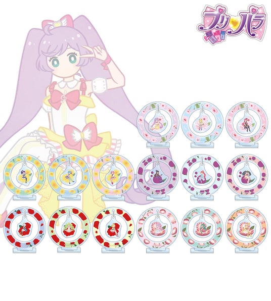 真中らぁら、南みれぃ、北条そふぃ、東堂シオン、ドロシー・ウェスト、レオナ・ウェスト、黒須あろま、白玉みかん、ガァルル、紫京院ひびき、ファルル、緑風ふわり、真中のん、月川ちり、太陽ペッパーのイラストをボタニカルデザインに落とし込んで繊細なタッチで新たに描き起こし、ゆらゆら動くアクリルスタンドに仕上げました。
