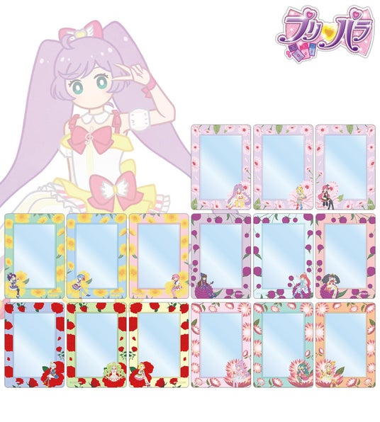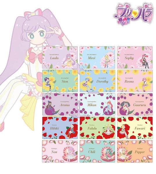 真中らぁら、南みれぃ、北条そふぃ、東堂シオン、ドロシー・ウェスト、レオナ・ウェスト、黒須あろま、白玉みかん、ガァルル、紫京院ひびき、ファルル、緑風ふわり、真中のん、月川ちり、太陽ペッパーのイラストをボタニカルデザインに落とし込んで繊細なタッチで新たに描き起こし、カードステッカーに仕上げました。