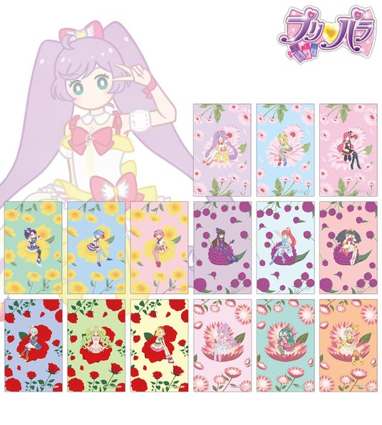 真中らぁら、南みれぃ、北条そふぃ、東堂シオン、ドロシー・ウェスト、レオナ・ウェスト、黒須あろま、白玉みかん、ガァルル、紫京院ひびき、ファルル、緑風ふわり、真中のん、月川ちり、太陽ペッパーのイラストをボタニカルデザインに落とし込んで繊細なタッチで新たに描き起こし、イラストカードに仕上げました。