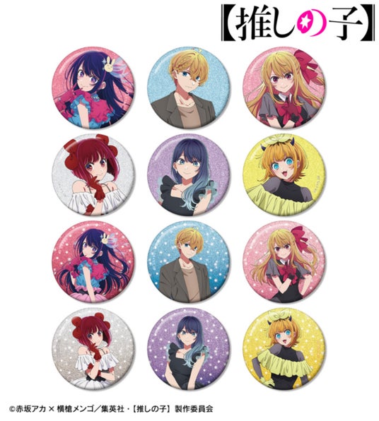 アイ、アクア、ルビー、有馬かな、黒川あかね、MEMちょのイラストをグリッター加工を施した缶バッジに仕上げました。