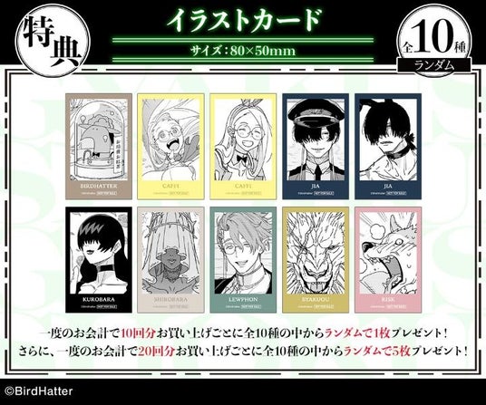一度のお会計で10回分ご購入ごとに特典イラストカード(全10種)の中からランダムで1枚、20回分ご購入ごとにランダムで5枚プレゼント!